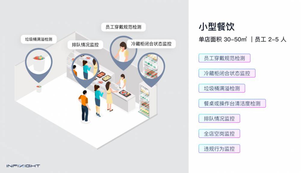 对于面积 30-50㎡ 的小型餐饮门店,人力短缺与空间紧凑是核心痛点。员工在高峰时段往往疲于应付订单,容易忽视冷藏柜闭合状态、操作台清洁度等细节。AI 点检系统通过「全店空岗监控+违规行为识别」双模块联动,实时追踪员工离岗时长与工作状态。当检测到员工在客座区长时间逗留或使用手机时,系统自动推送提醒至店长端,结合「排队情况监控」数据,动态优化人力排班。
