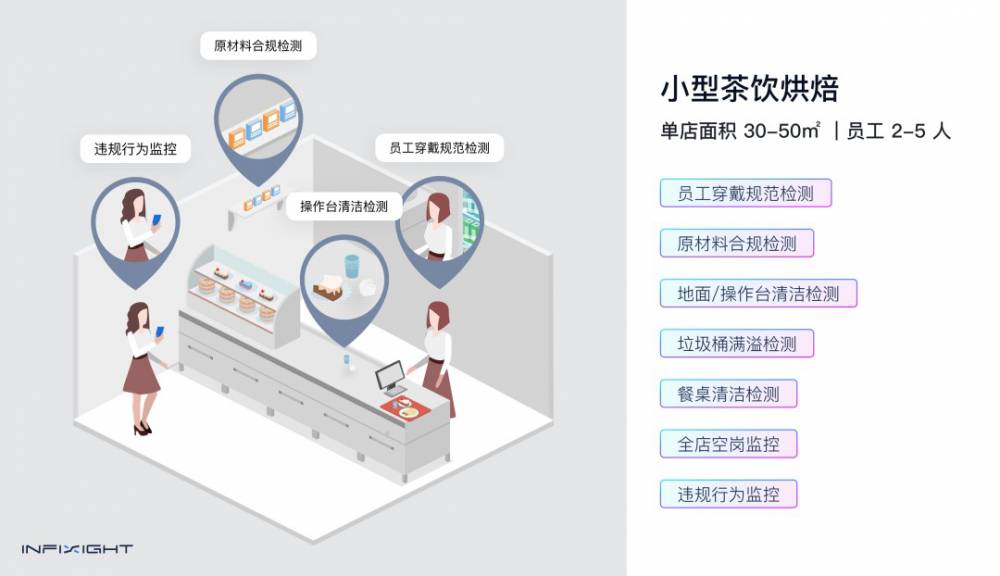 茶饮烘焙行业对操作标准化与消费体验的要求近乎苛刻。在 30-50㎡的小型门店,系统聚焦两大管理维度:一是原材料合规检测,通过视觉识别原料包装完整性、有效期标签清晰度,杜绝过期物料流入生产环节;二是客座区体验管理,实时监测餐桌清洁度、垃圾桶溢满状态,确保顾客触点的品质一致性。