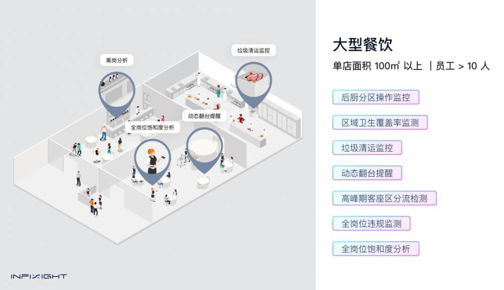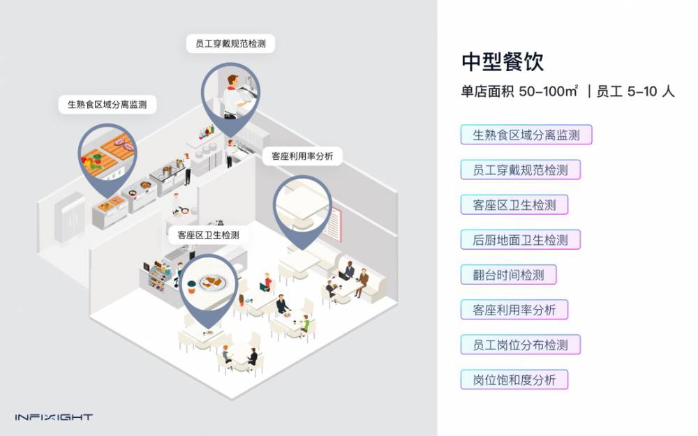 中型餐饮门店(50-100㎡)的管理重心转向流程协同与坪效提升。系统内置的「翻台时间检测」模块,通过分析餐桌清洁、点餐结账等环节耗时,自动生成服务效率数据。而「生熟食区域分离监测」功能,则通过 AI 视觉实时识别砧板交叉使用风险,将食品安全违规率从每月 12 次降至 0.8 次。