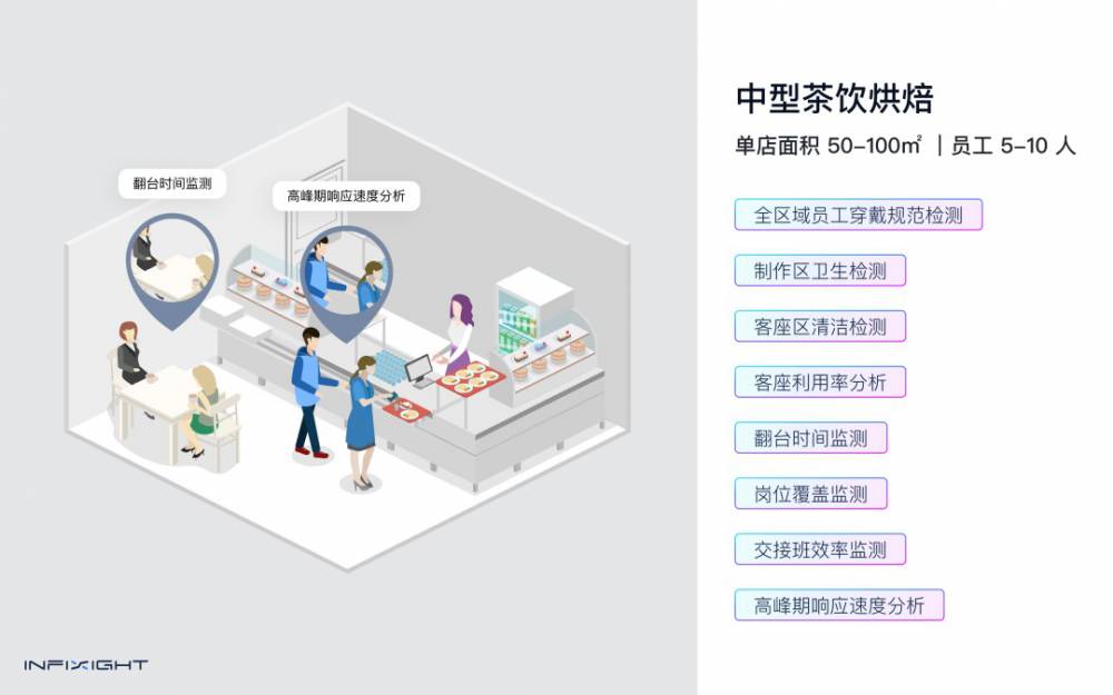 中型门店(50-100㎡)的管理复杂度有所提升。系统通过「制作区卫生检测」模块识别操作台面、设备等问题,配合「客座利用率分析」功能,帮助门店优化空间布局。