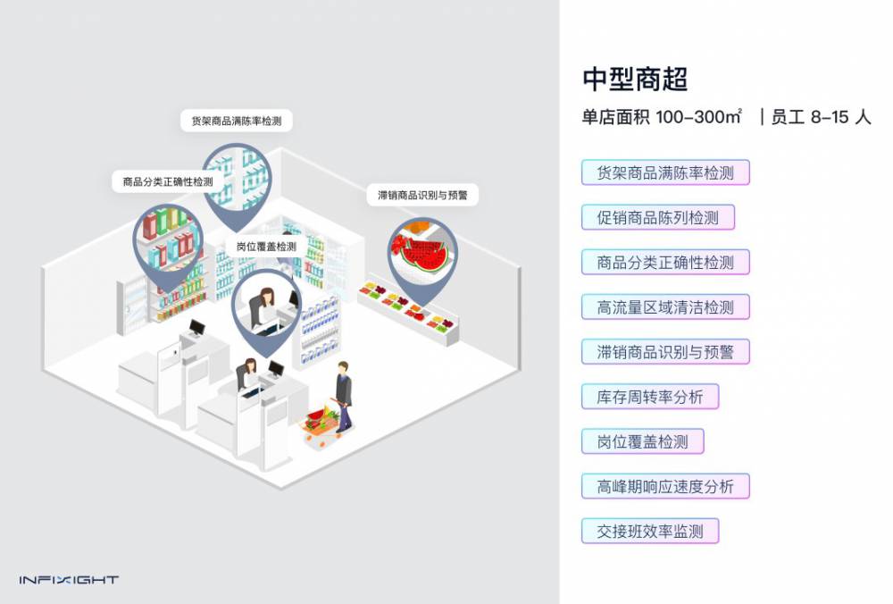 中型商超面临品类管理与服务响应的双重压力。系统通过「商品分类正确性检测」,实时监控生鲜区、日化区的错放商品。在高峰时段,「岗位覆盖检测」与「高峰期响应速度分析」双模块协同运作:当收银台排队超 x 人时,系统自动建议开启备用通道。