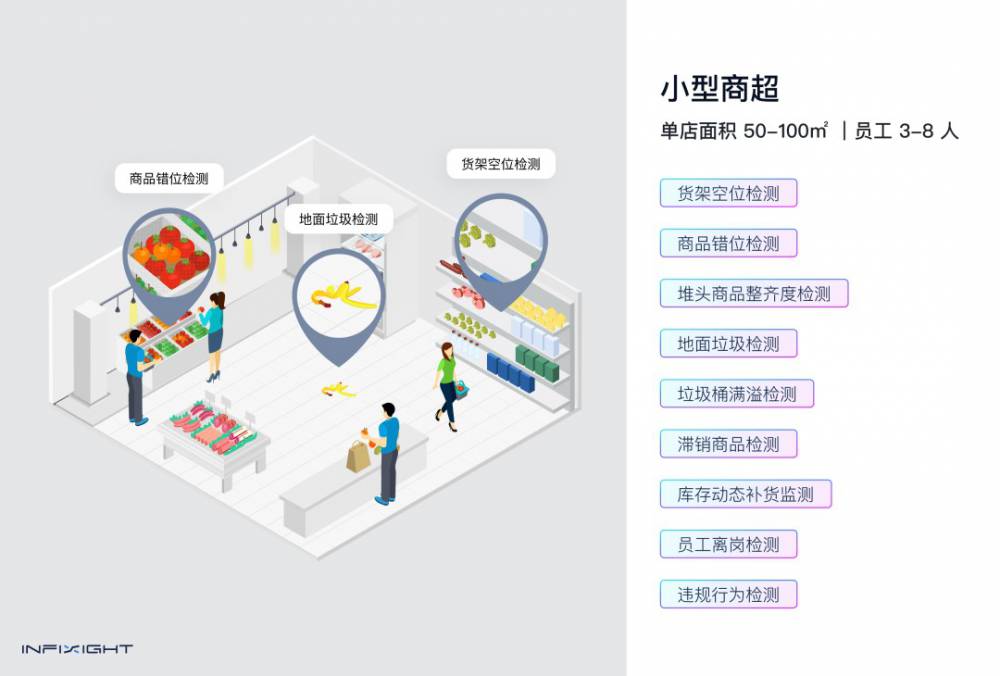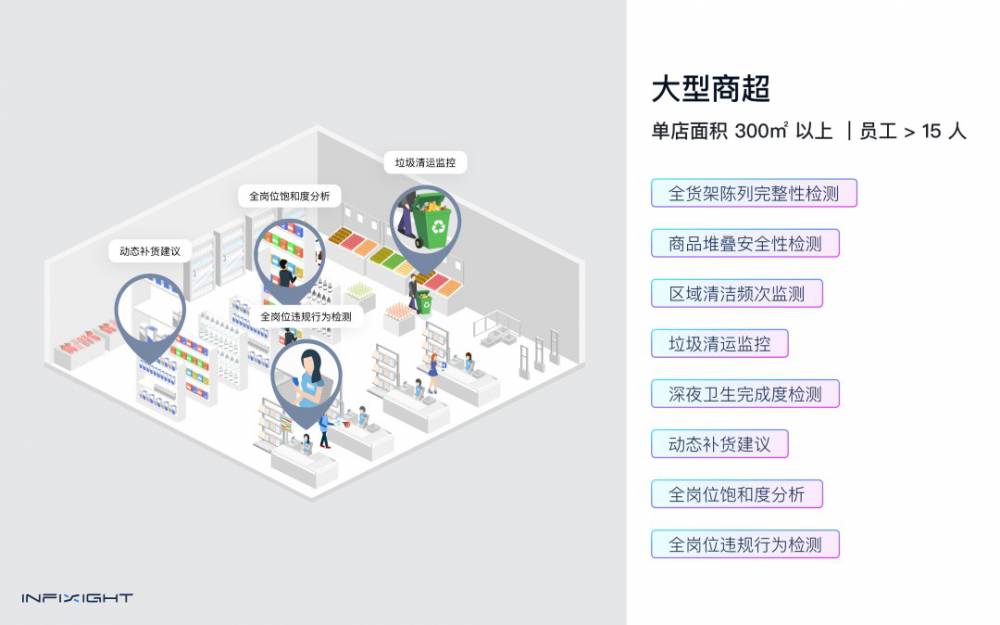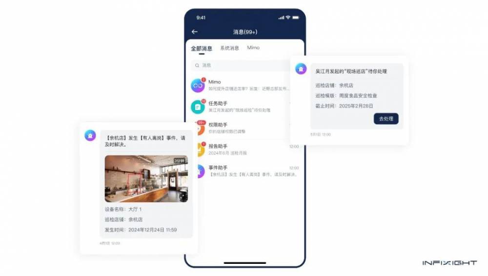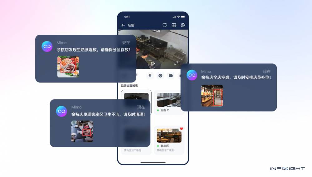 系统搭载的 Mimo Vision 大模型突破传统视觉算法的场景局限性,基于深度学习的多维度场景理解能力,可精准识别近百种业务场景。在餐厅后厨,实时监测垃圾桶满溢、生熟食混放、冷藏柜未闭合等风险;在商超零售场景中自动检测货架空置率、促销商品陈列规范、地面清洁度等关键指标;针对茶饮门店,则聚焦操作台卫生、原料合规性、客座区利用率等细节。系统能根据不同业态、不同规模门店的管理重点,动态调整监测策略。