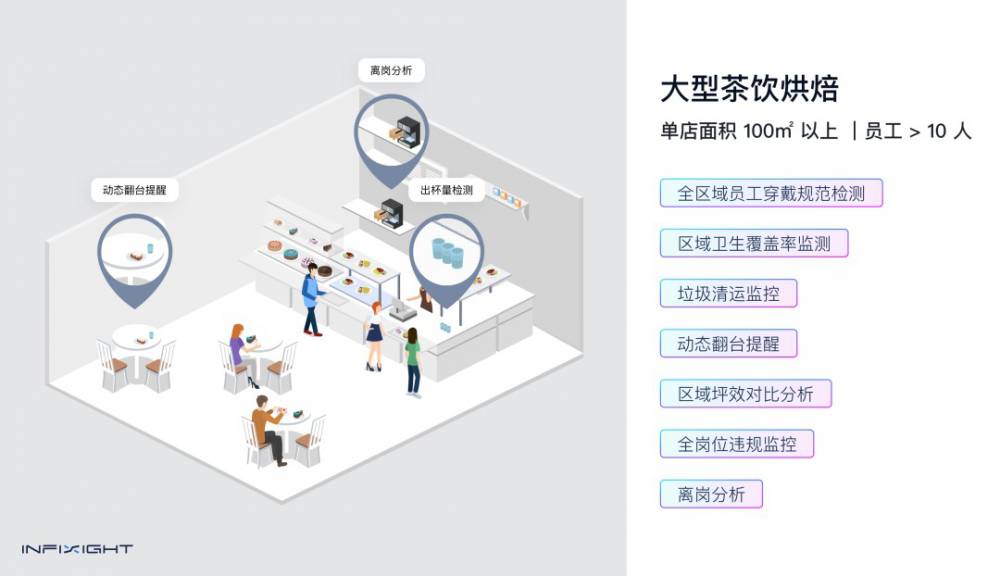 大型茶饮烘焙门店(100㎡以上)则需应对多区域协同挑战。系统除了检测员工穿戴、门店卫生、空岗等,还能通过「区域坪效对比分析」模块帮助管理者识别低效空间。